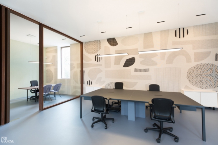 本辦公室裝修設(shè)計時,設(shè)計師大量采用了現(xiàn)代手法,大面積的使用淺色木飾面、素色墻布,另外加了一些玻璃磚及石材做點綴,整個空間更加清爽,自然。