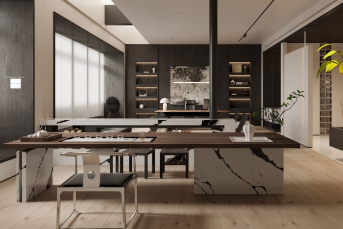 本次方案展示中,偏重于各個工作空間的展示,例如會議室、接待室、包廂區(qū)域,設(shè)計師通過簡化線條、色彩和空間布局,使各個區(qū)域更加寬敞明亮。設(shè)計師摒棄了繁瑣的裝飾和復(fù)雜的造型,讓人們在視覺上得到放松。